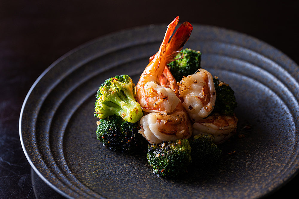 鉄板や万菜では、定番人気の小海老とブロッコリーのガーリック鉄板焼きが、今夜も香ばしく湯気を立てています。