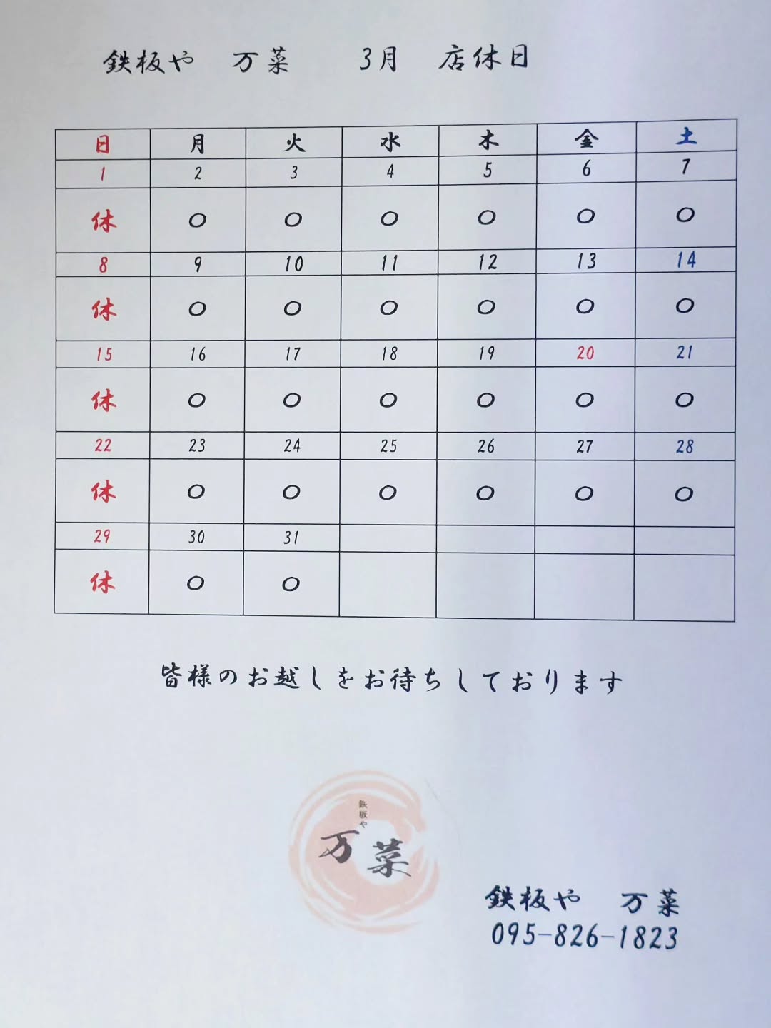 【2026年3月営業日・店休日】のお知らせ